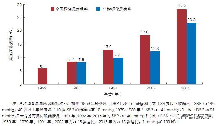 從1959年到2015年,高血壓患病率快速上升,至2015年全國(guó)調(diào)查患病率粗率已達(dá)27.9%,這意味著每四個(gè)成人至少有一個(gè)有高血壓。