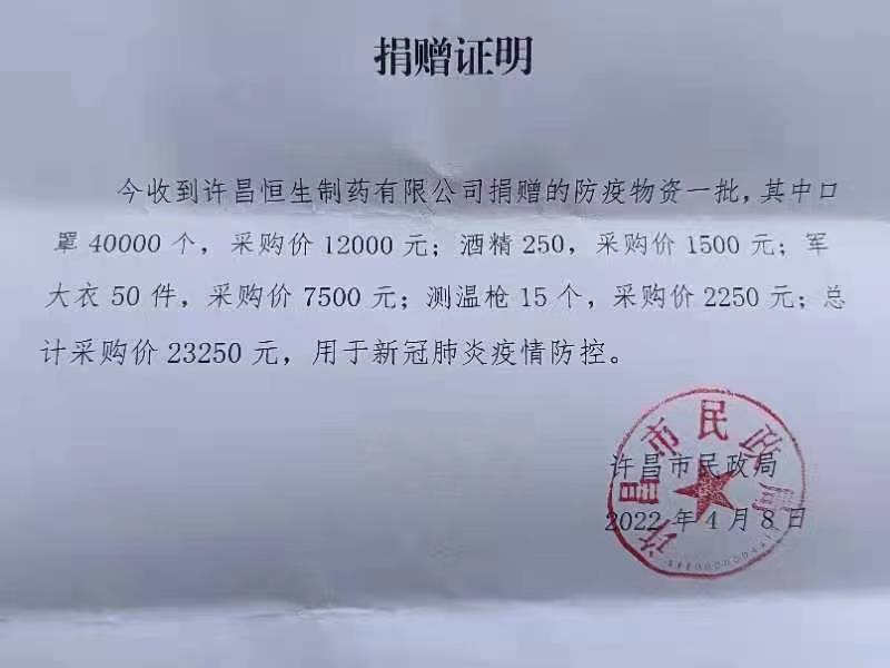 2022年04月08日許昌恒生制藥有限公司向許昌市民政局捐贈(zèng)物資助力疫情防控,為疫情防控盡一點(diǎn)綿薄之力。